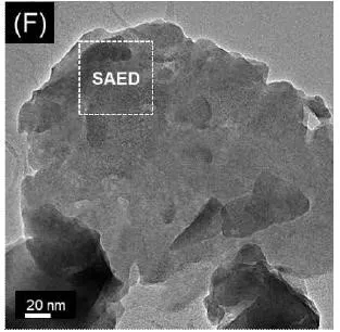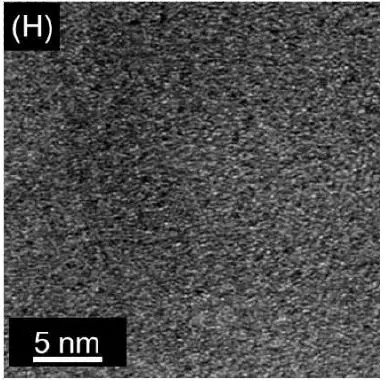圖F為一個(gè)典型的砂磨后的Ta-LLZO顆粒的STEM照片。經(jīng)過砂磨的細(xì)顆粒表面較為粗糙,對其中白色虛線框標(biāo)記的區(qū)域做選區(qū)電子衍射(SAED),結(jié)果如圖G所示。電子衍射花樣為展寬明顯的多晶德拜環(huán),最亮的環(huán)對應(yīng)于晶面間距為0.31nm的(240)面。該面間距比純Ta-LLZO粉體和H+交換后的Ta-LLZO晶格中的數(shù)值大。說明砂磨后的細(xì)Ta-LLZO顆粒表面和內(nèi)部晶格變形并多晶化。圖H為顆粒表面的HRTEM原子排列圖像。該圖像表明,Ta-LLZO在極小的疇區(qū)內(nèi)(1~2nm)有序排列,但不同疇區(qū)的排列完全是無序的,進(jìn)一步證實(shí)了砂磨顆粒的多晶化,利于后續(xù)燒結(jié)。